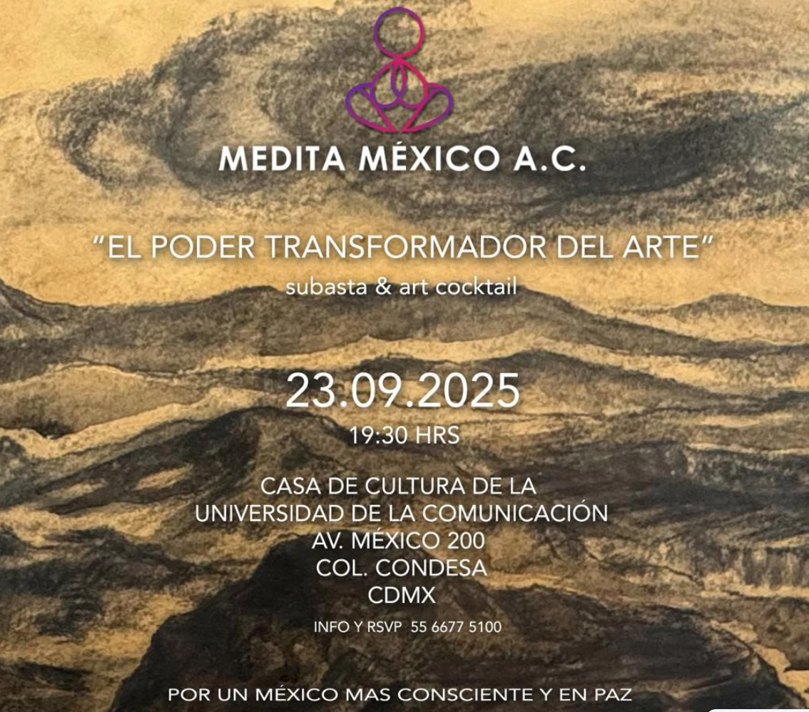 Fundación Medita México A.C. realizará la 3ª Subasta con Causa “El Poder Transformador del Arte” el martes 23 de septiembre, 19:30 h, en la Casa de Cultura de la Universidad de la Comunicación (Av. México 200, Col. Hipódromo Condesa, CDMX).