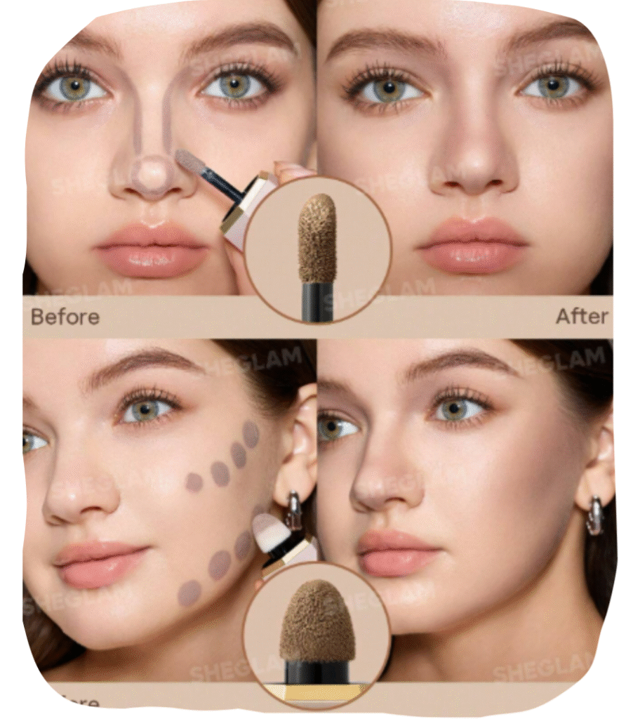 El objetivo es crear sombras suaves, no líneas marcadas. Puedes difuminar con una brocha angular o esponja. El Precision Sculpt Duo Contour tiene un aplicador delgado y otro grueso que te permiten contornear con más precisió