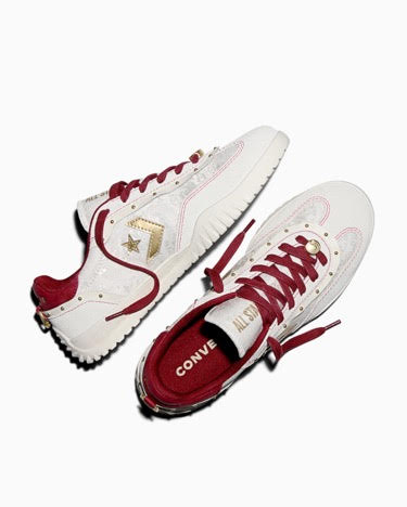- Chuck 70 Tassel Edition – con upper de satín tejido y flecos de piel removibles, en una paleta rojo con blanco, acentuada por una herradura dorada en forma de D-ring que aporta un toque vibrante a la silueta clásica.
