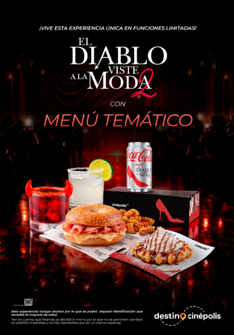 Como parte de este estreno, Cinépolis VIP presentará un menú temático exclusivo inspirado en el universo de la cinta que llevará la propuesta más allá del cine. Disponible en 31 funciones especiales en 23 cines VIP a nivel nacional, este paquete incluirá el acceso a la película junto con un menú de dos tiempos y dos bebidas con alcohol, además de una Coca-Cola Light edición especial. El menú está compuesto de:
