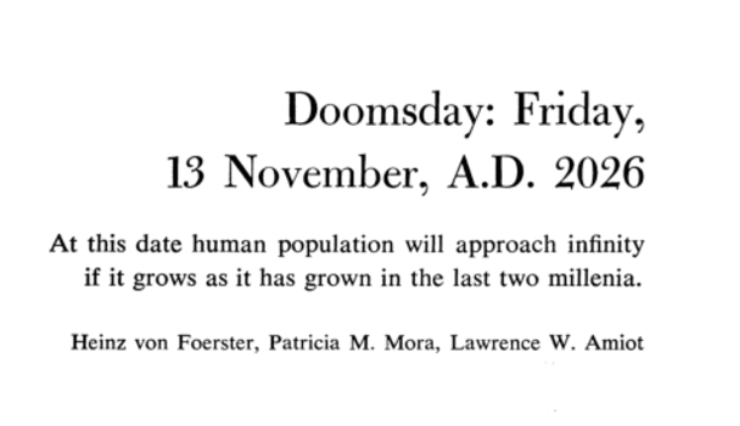 En 1960, tres científicos, Heinz von Foerster, Patricia Mora y Lawrence Amiot, publicaron en la revista Science un estudio tan perturbador como visionario: Doomsday: Friday, 13 November A.D. 2026, a través de un modelo matemático los investigadores predijeron el colapso de la civilización no por una amenaza externa, sino por la acción del propio ser humano.