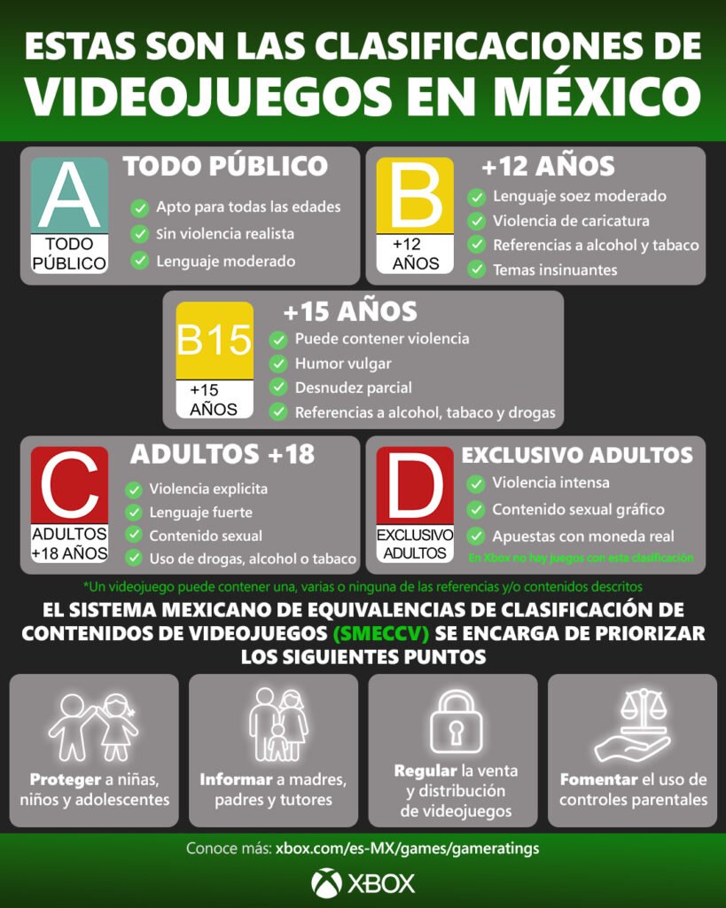 A continuación, te explicaremos cómo funciona el Sistema Mexicano de Equivalencias de Clasificación de Contenidos de Videojuegos (SMECCV) y qué acciones implementa Xbox para que estas clasificaciones aseguren y respeten la experiencia de juego en todos los niveles.