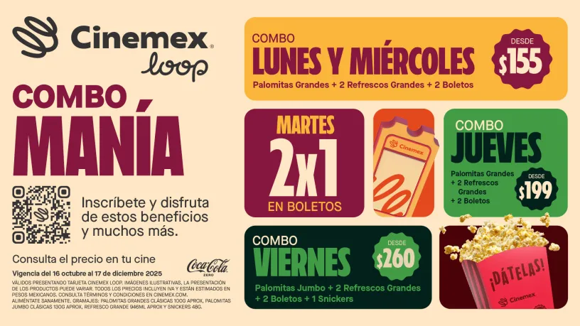 Del 16 de octubre al 17 de diciembre ¡llega la Combo manía a Cinemex!, una explosión de sabor, diversión y beneficios a precios increíbles durante toda la temporada, que estarán disponibles de lunes a viernes para los miembros del programa de lealtad Cinemex Loop.