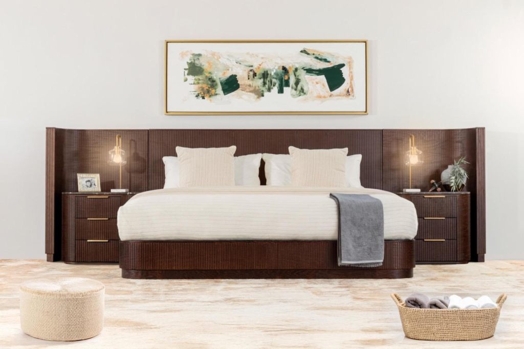 La Recámara Astor, en tono nogal, se convierte en un ejemplo de cómo la nobleza de los materiales transforma la experiencia del descanso. Esta pieza además, responde a la tendencia de recámaras con cabeceras extendidas, que van más allá del tamaño tradicional del respaldo, abarcan gran parte de la pared e incluso pueden integrar burós, repisas o soluciones funcionales, creando un foco visual arquitectónico en la habitación.