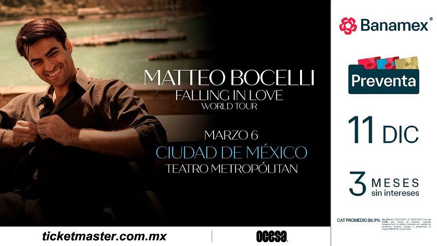 Si buscas una noche donde la pasión, la juventud y la herencia vocal se fusionen con el pop moderno, el concierto de Matteo Bocelli es una cita obligada. ¡Corre por tus boletos para el 6 de marzo en el Teatro Metropólitan y sé testigo del talento de esta nueva estrella italiana!