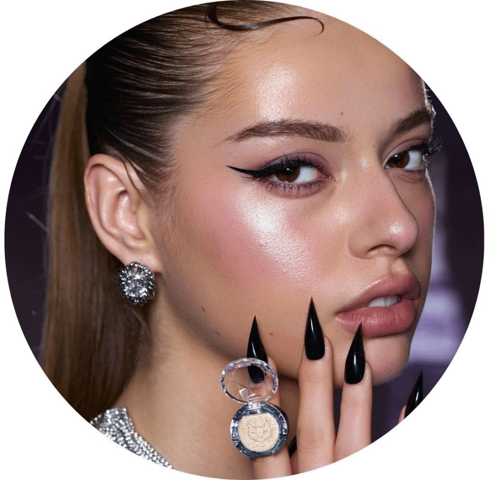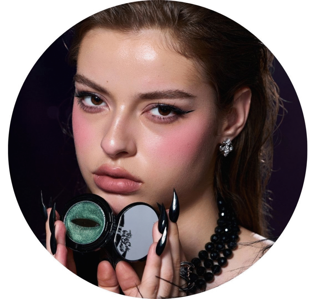 Utiliza un blush nacarado en capas ligeras. El Blush Black Cat tiene forma de ojo de gato y cambia de color al contacto con piel: deposita poco producto y difumina suave para que revele su tono. El objetivo es resaltar pómulos sin saturar.