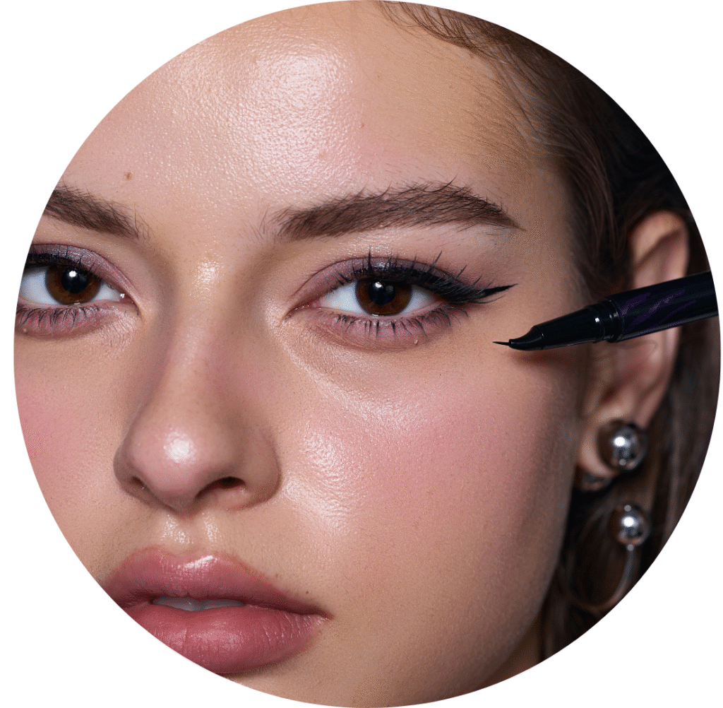 Traza una línea muy pegada a las pestañas y estírala en ángulo ascendente. Si quieres dramatismo extra, delinea por dentro y marca la esquina del lagrimal. La punta del Delineador de ojos Meow es ultrafina y está a 30°, lo que facilita trazos precisos.