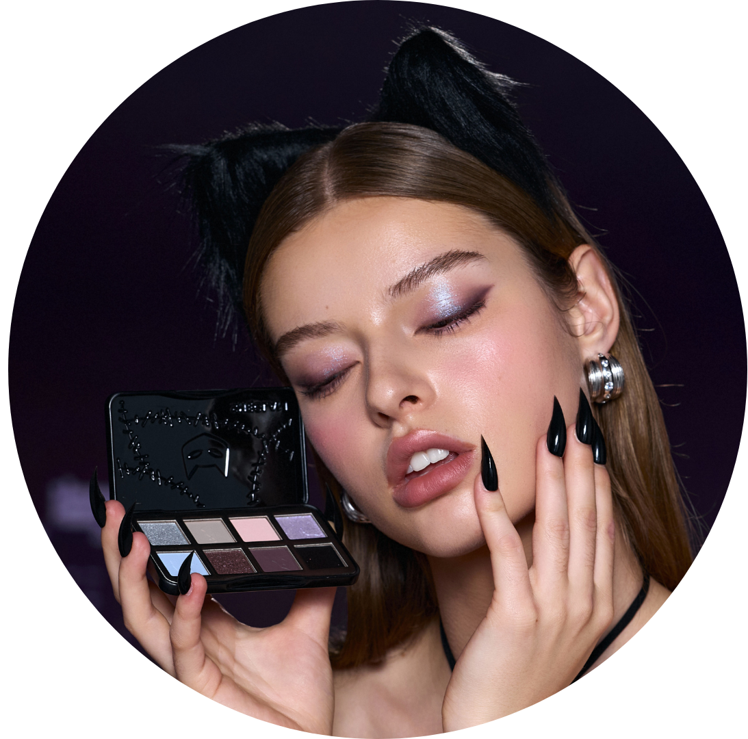 Para construir un ojo ahumado y alargado aplica un tono medio en la cuenca, profundiza con el más oscuro en esquina externa y difumina hacia afuera para esa forma rasgada felina. Añade un toque metálico en el centro del párpado si quieres dimensión sin perder el mood nocturno. La Paleta de sombras Feline Fatale tiene 8 tonos con acabados mate, perlados y reflejantes de alto impacto.