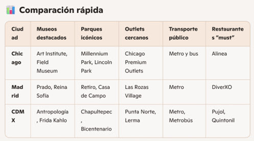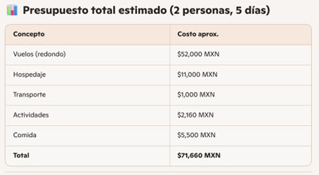 Prompt sugerido: “Arma un presupuesto total estimado de dos personas tomando en cuenta el avión, hospedaje, transportación, costo de las actividades sugeridas como museos y el aproximado de gastos de comida”