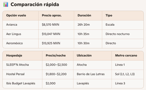 Prompt sugerido: “Busca vuelos en julio para viajar a Madrid; prefiero viajar de noche y saldré de Ciudad de México. Dame precios aproximados y las mejores recomendaciones, además, dame las mejores sugerencias económicas de hospedaje y de preferencia que estén cerca de algún metro”.