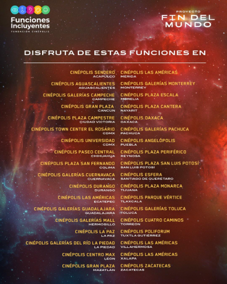 Proyecto Fin del Mundo llegará a las salas de Cinépolis el 19 de marzo. Los boletos pueden adquirirse en la taquilla, dulcería o a través de la app y el sitio oficial de Cinépolis, donde las funciones están claramente identificadas como Funciones Incluyentes. Estos espacios las permiten que más personas puedan acceder a la cartelera comercial.