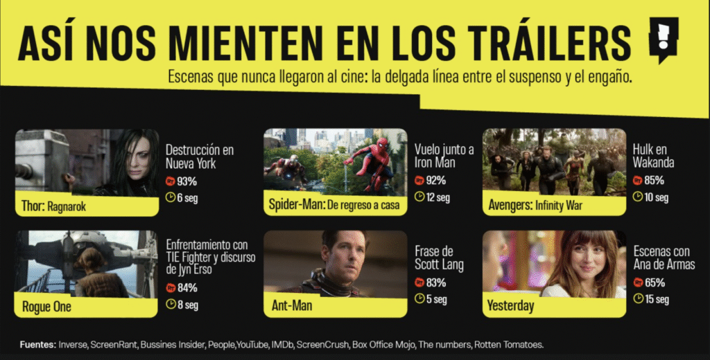 Entre los casos más sonados están Avengers: Infinity War, Yesterday, Spider-Man: De Regreso a Casa y Rogue One: Una Historia de Star Wars, ejemplos claros de cómo Hollywood domina el arte de venderte una película que nunca verás.