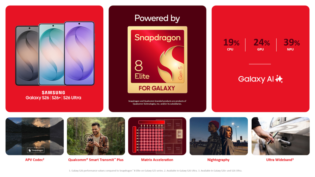 Qualcomm Technologies, Inc. presentó hoy su plataforma móvil Snapdragon® más avanzada hasta la fecha, la plataforma móvil Snapdragon® 8 Elite Gen 5 para Galaxy, que impulsará el Samsung Galaxy S26 Ultra a nivel mundial y los Galaxy S26+ y S26 en regiones seleccionadas. Equipada con la CPU Qualcomm Oryon™ de 3ª generación de diseño propio, la innovadora GPU Qualcomm® Adreno™ y la avanzada NPU Qualcomm® Hexagon™, la plataforma impulsa nuevas y extraordinarias capacidades para los usuarios de Galaxy, desbloqueando flujos de trabajo más rápidos, capacidades de cámara mejoradas, incluida la captura de vídeo profesional avanzado (APV)