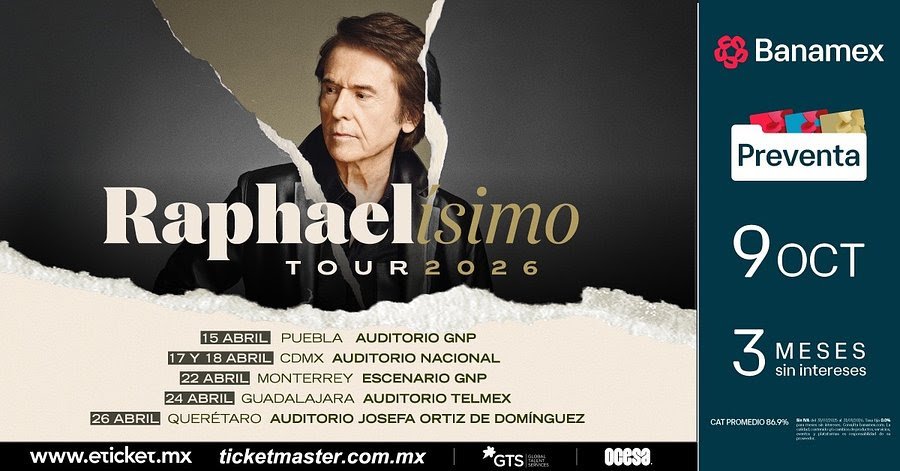 Raphael, el eterno Divo de Linares, regresa a los escenarios de México con Raphaelísimo, un espectáculo superlativo que captura la esencia de una carrera única en la historia de la música en español. La gira 2026, reúne los grandes éxitos que lo han convertido en un icono como “Yo Soy Aquel”, “Mi Gran Noche” y “Escándalo”, junto con las canciones de su aclamado nuevo álbum Ayer… Aún, un tributo exquisito a la ‘chanson francesa’ y homenaje a artistas de la talla de Edith Piaf y Charles Aznavour.