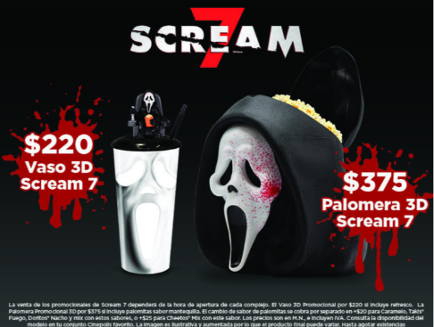 Además, como parte del estreno, Cinépolis lanzará dos promocionales coleccionables inspirados en el universo de Scream 7: un Vaso Promocional 3D y una Palomera Promocional 3D, disponibles primero en venta exclusiva para socios Club Cinépolis y, posteriormente, en venta general.