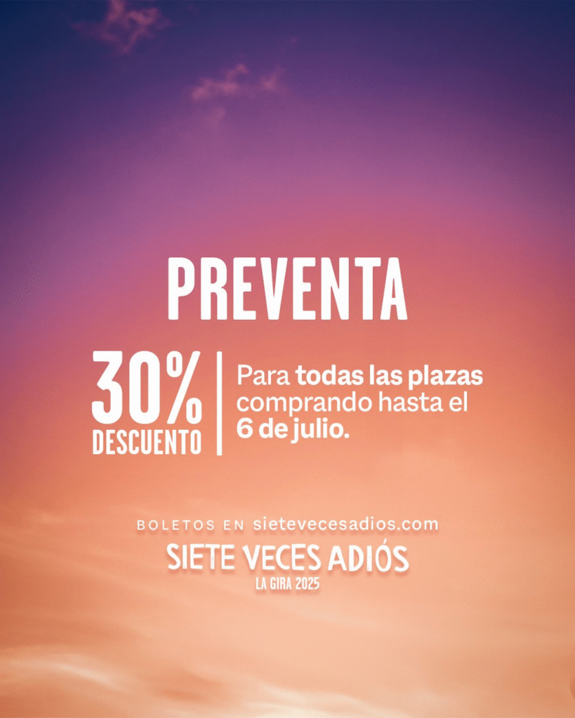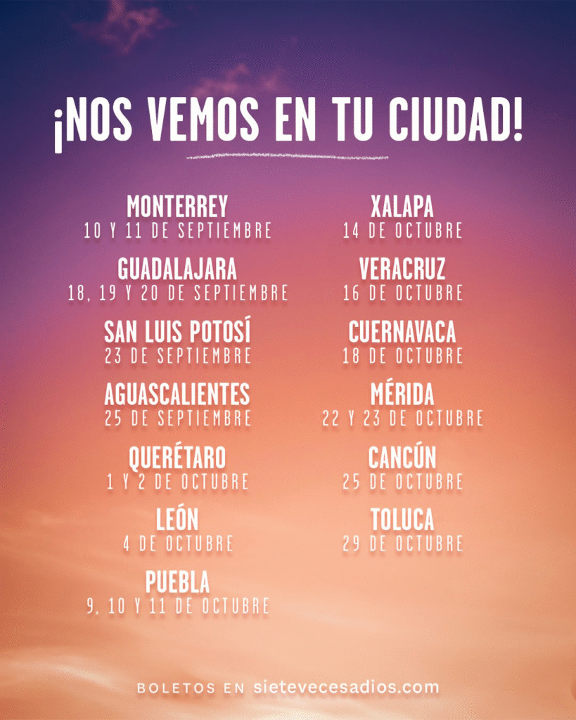 Todas las fechas ya están disponibles en preventa especial hasta el 6 de julio con 30% de descuento en www.sietevecesadios.com, donde también se pueden consultar los horarios de cada presentación.