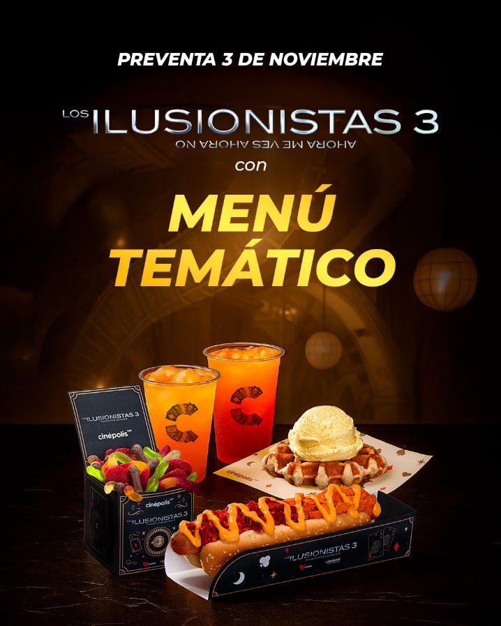 En noviembre, Cinépolis invita a los amantes de la magia y el misterio a disfrutar el preestreno de Los Ilusionistas 3. La esperada tercera entrega de la saga llega a los cines junto con un menú temático de tres tiempos, inspirado en la cinta, y que celebra el ingenio de la magia.